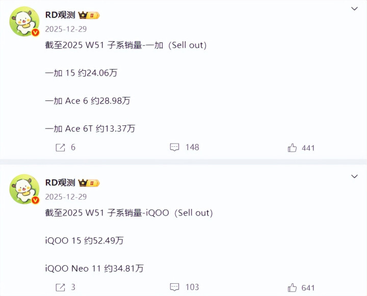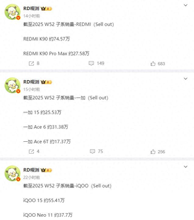 根据“RD观测”提供的数据,截止W52周iQOO 15的累计销量达到55.41万台,iQOO Neo 11的累计销量达到37.7万台。二者合计达到93.11万台,这是直奔100万台而去了。一加15的累计销量为25.53万台,一加Ace 6的累计销量为31.38万台,一加Ace 6T的累计销量为17.37万台,三者累计为74.28万台。REDMI K90的累计销量为74.57万台,REDMI K90 Pro Max的累计销量为27.58万台,二者合计达到102.15万台。且REDMI K90系列是子系品牌中第一个整体销量突破100万台,看来REDMI K90系列后续逐渐获得了市场认可。